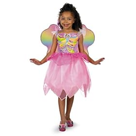 Girls favorite Barbie Fairy! Just through the rainbow, in the magical world of Fairytopia lives a Flower Fairy named Elina, who longs to have wings. In the hit dvd, Magic of the Rainbow, she goes on a magical journey and along the way finds and the value of true friendship. This beautifully colored costume will delight all girls and with the detachable wings to complete the costume, they will be feeling like they are a true Barbie! Includes: Dress and detachable wings(shoes not included).